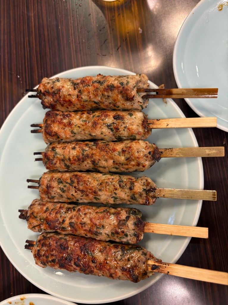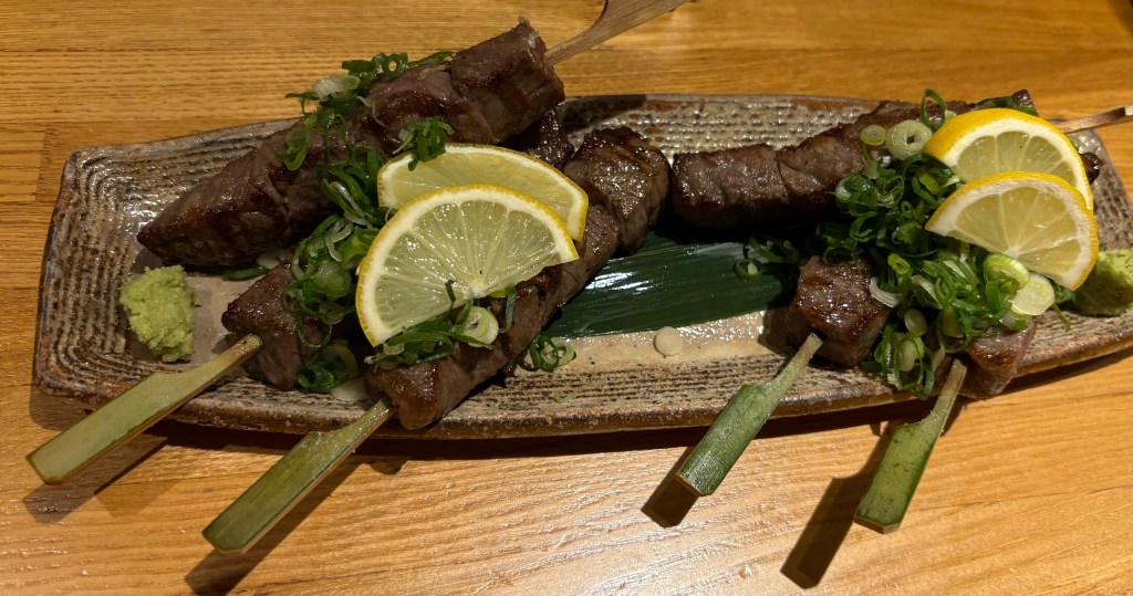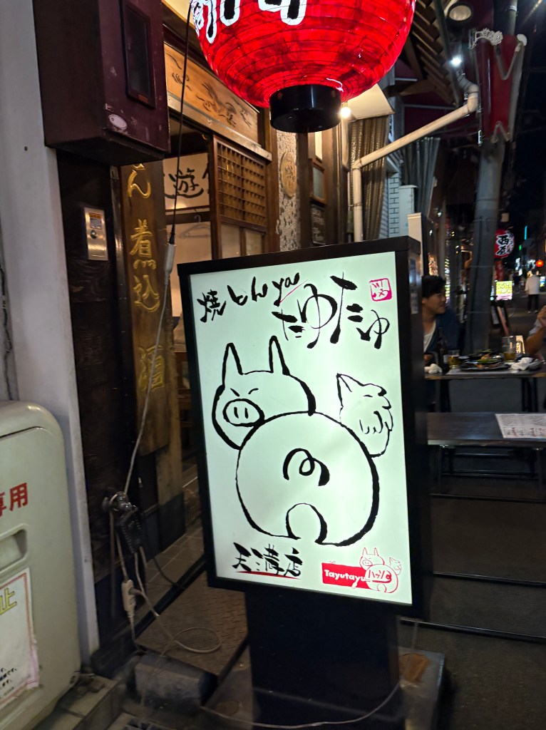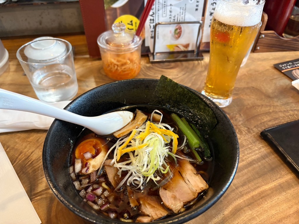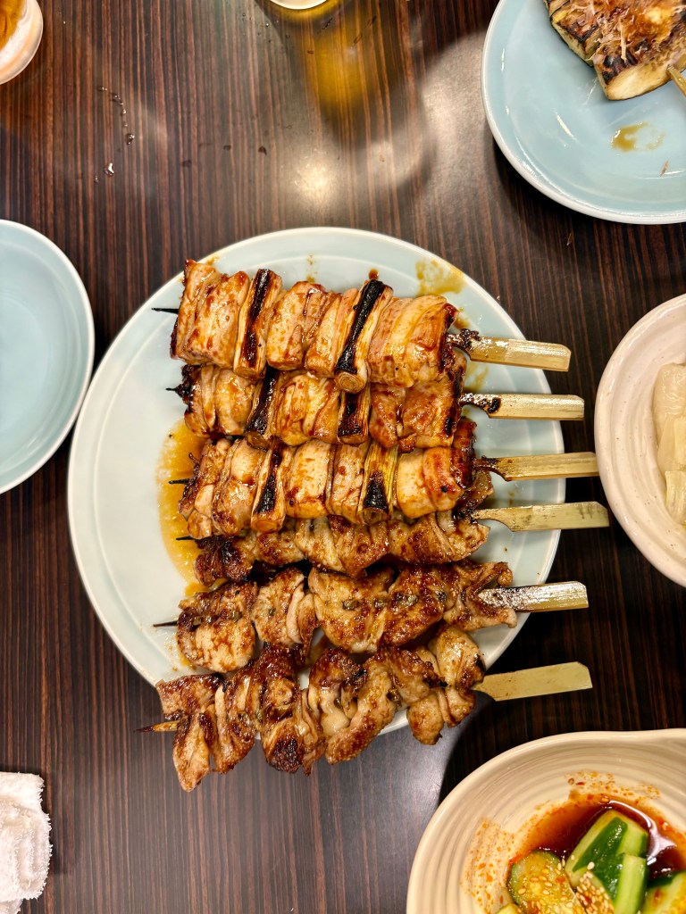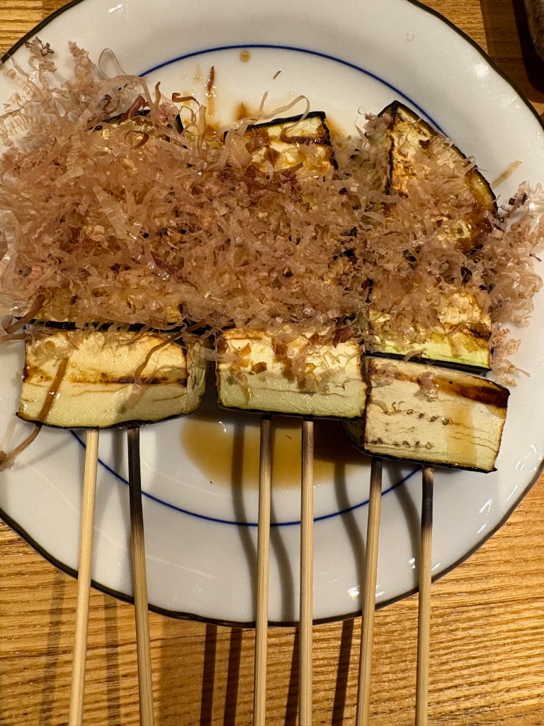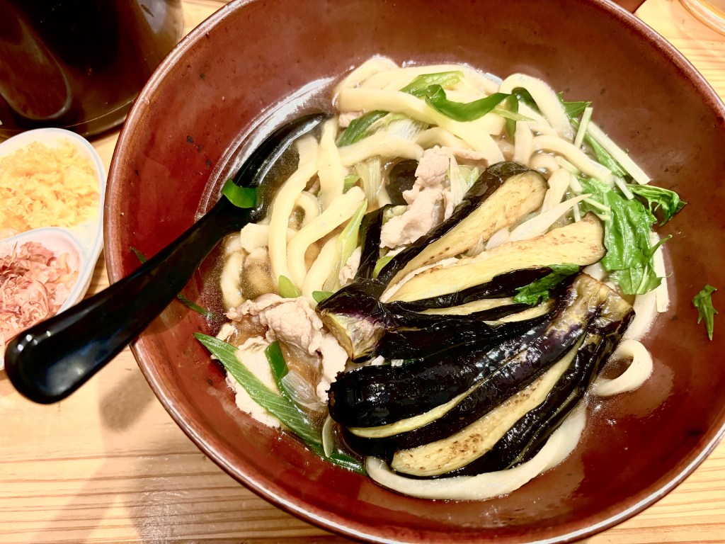 My favorite meal in Tokyo happened when we stepped into a tiny udon noodle shop. It could maybe hold eight – ten customers. We were ushered into a tiny booth, sitting side by side. The table was divided vertically so that we and the people sitting across from us at the same table could have privacy visually, if not audibly. And you are supposed to be audible when eating noodles in Japan. It’s considered a statement of enjoyment and a compliment to the chef. As a person raised not to slurp or make noise it actually took a concerted effort to make the right sounds to reflect my joy at the meal. The food was incredibly delicious. Absolutely simple and rich and perfectly prepared. Mine was eggplant and pork with the homemade noodles and broth, and my mouth still waters thinking about it.