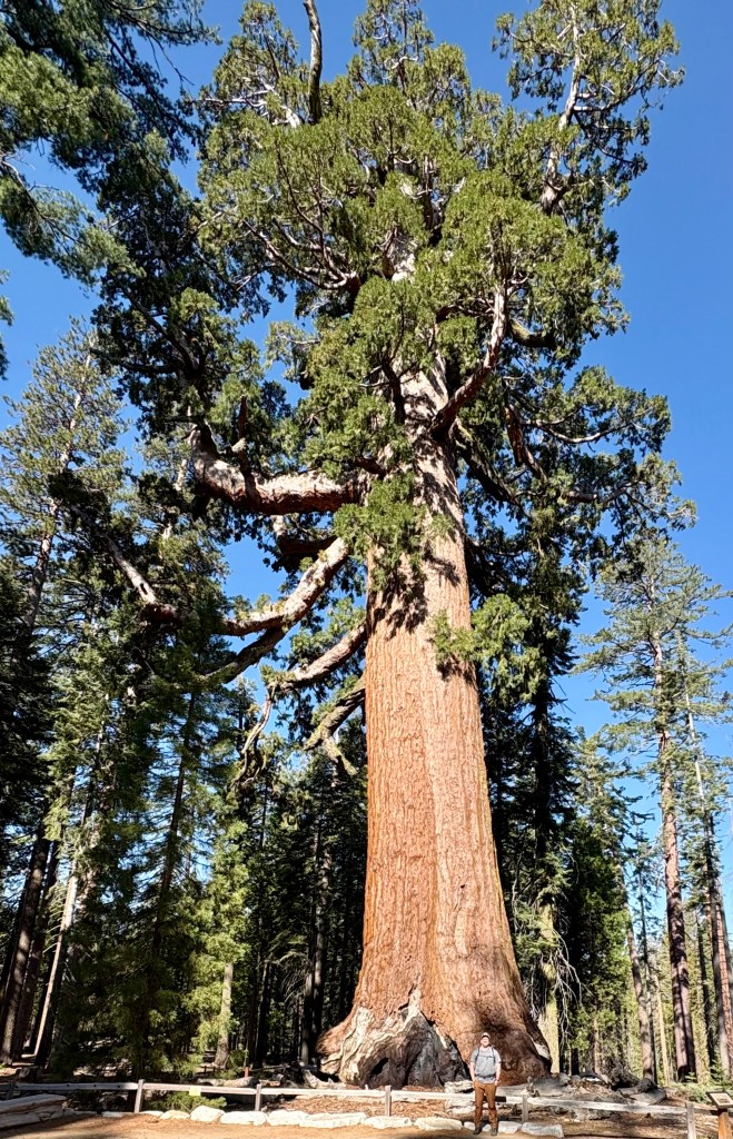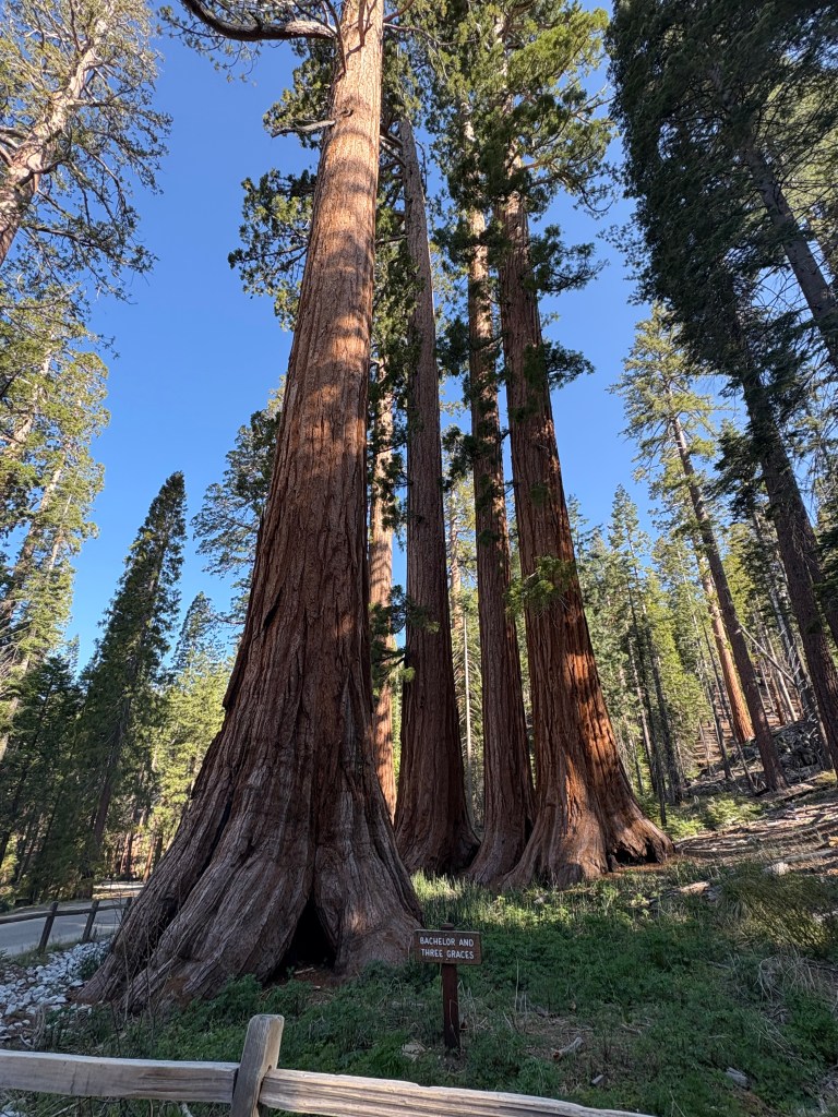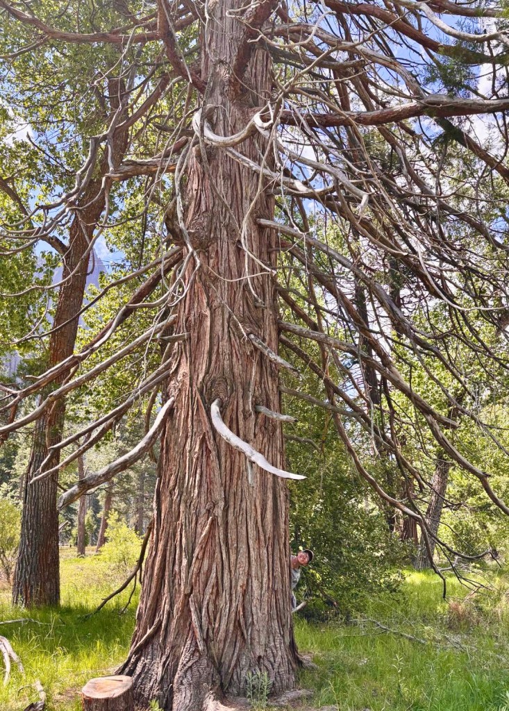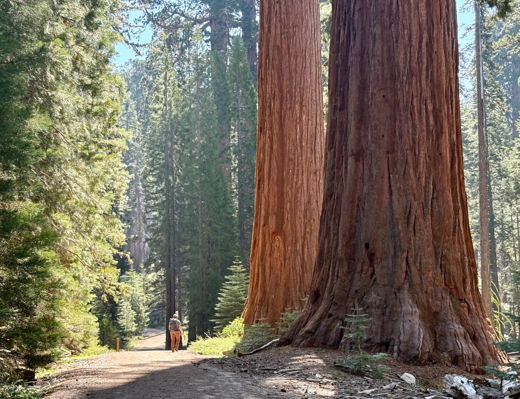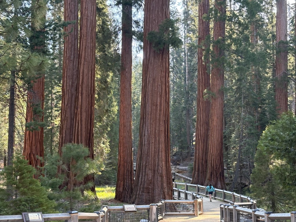 Sunday we came back to the park, this time heading to Mariposa Grove which has over 500 Giant Sequoia trees. Again. There can be no words or pictures that can give a true sense of walking among these ancient trees. We ended up hiking seven miles through and around some impressive trees up to yet an overview look out area, offering a different view of the surroundings and the valleys below. Simply staggering. While I know the pictures don’t do it justice, please examine them closely and see if you can see people near the trees to give you some idea of scale.