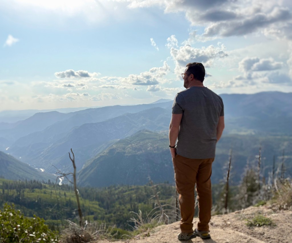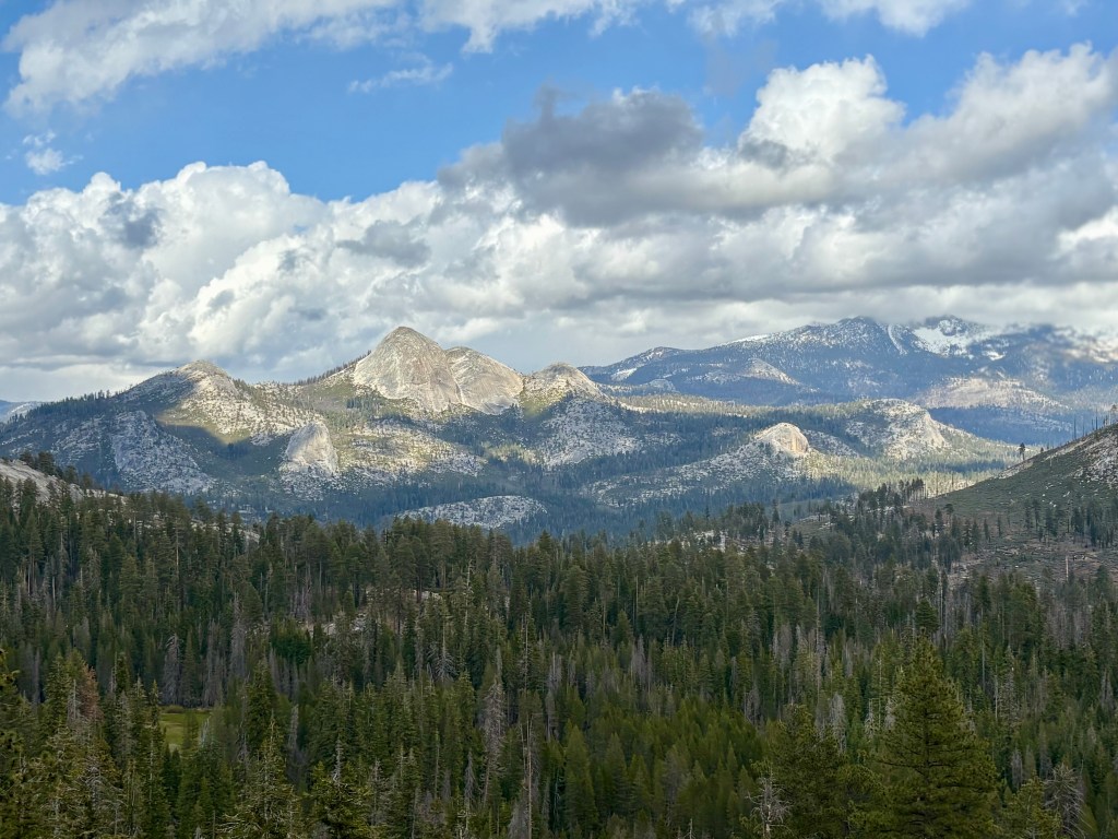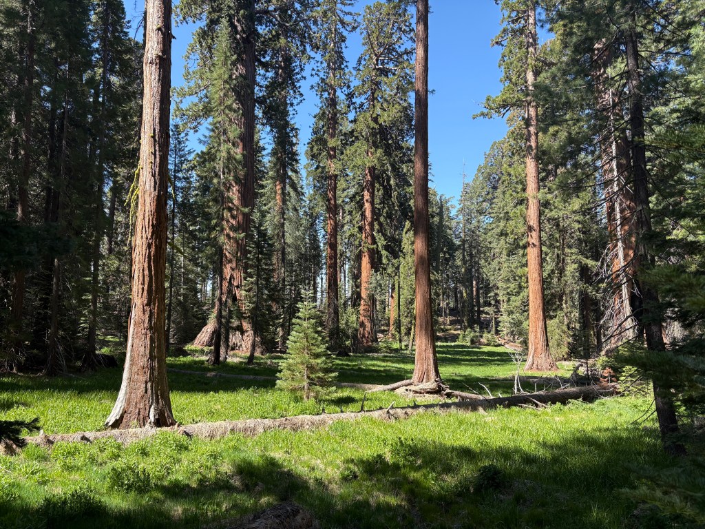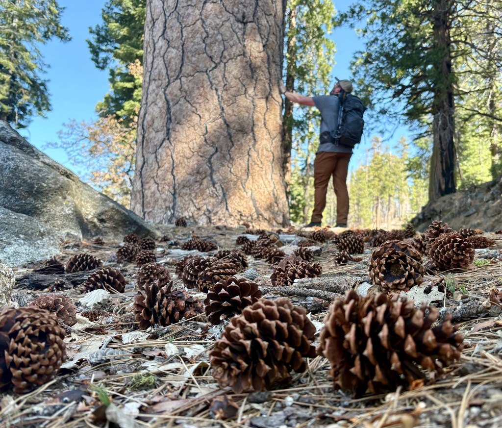 Sunday we came back to the park, this time heading to Mariposa Grove which has over 500 Giant Sequoia trees. Again. There can be no words or pictures that can give a true sense of walking among these ancient trees. We ended up hiking seven miles through and around some impressive trees up to yet an overview look out area, offering a different view of the surroundings and the valleys below. Simply staggering. While I know the pictures don’t do it justice, please examine them closely and see if you can see people near the trees to give you some idea of scale.