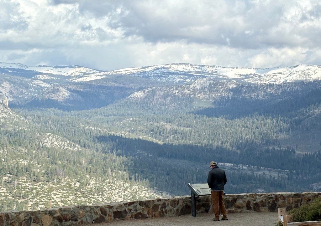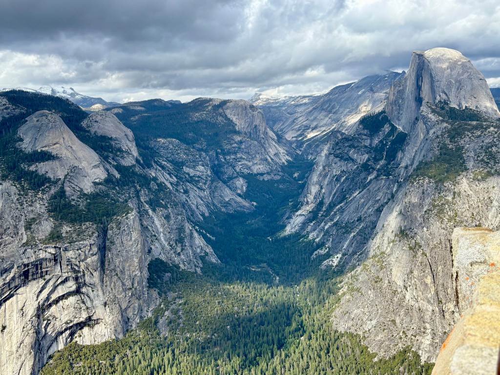 With only a day and a half to explore, we made the best of it. Saturday we spent exploring the valley floor stretching our necks at the glory all around and up. We hiked to the lower falls. We scored an excellent parking space that afforded us glorious views while eating lunch. After we had a full day in the valley we drove up – way up – to glacier point, where there was still a fair amount of snow in the shady pockets and the tall trees were furry with bright green lichen on their northern sides. From the vantage at Glacier point we could clearly see the Half Dome, El Capitan, the many waterfalls, and the distinct path that the glaciers took so many eons ago. It was magical and marvelous and so very old.