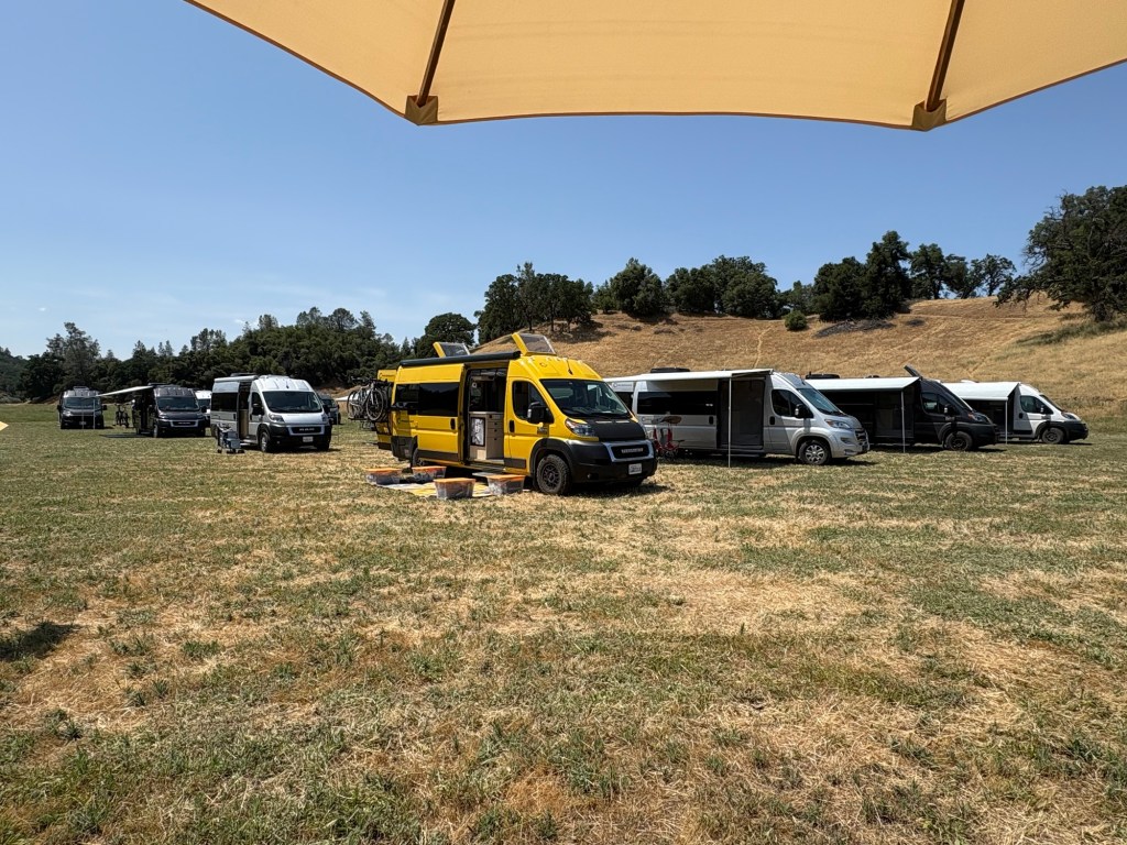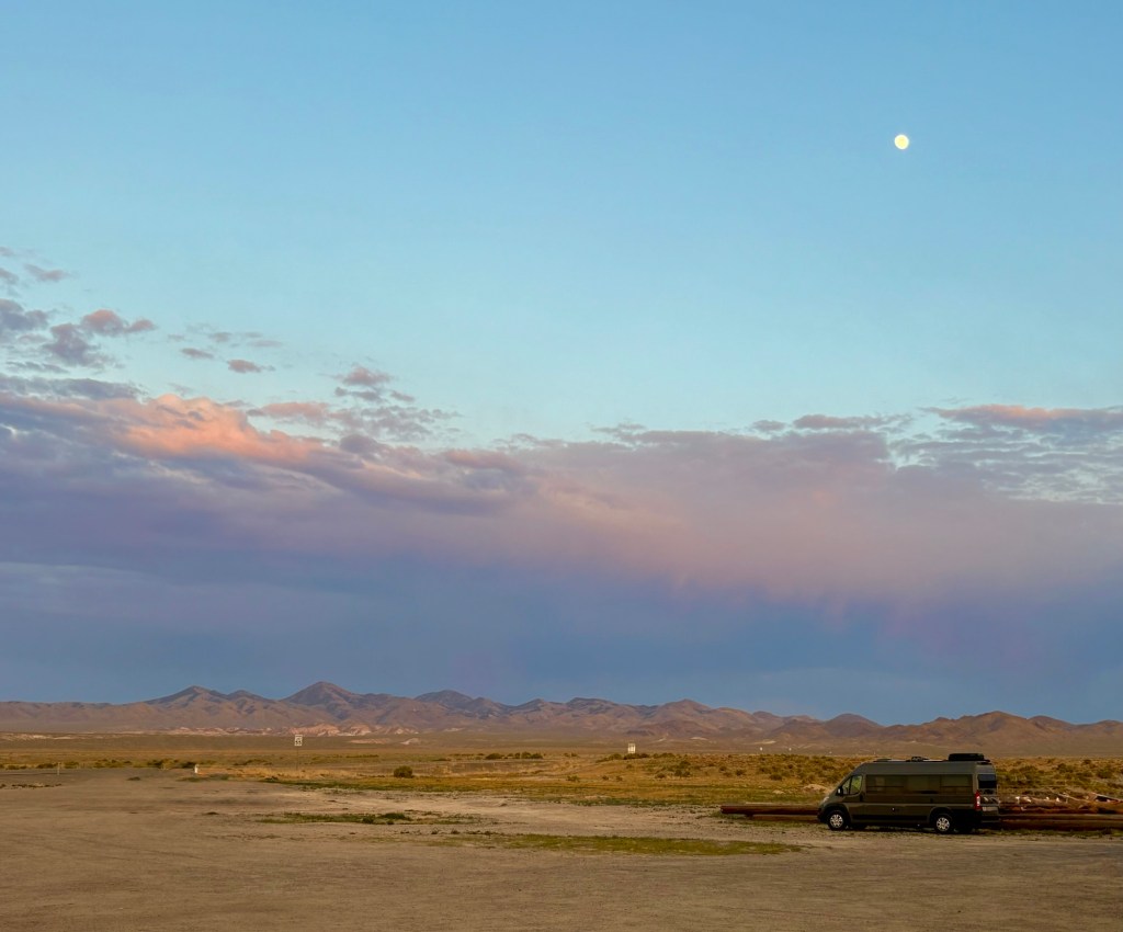 Now we are heading eastward, with plans for a few National Parks in the next week or so. The drive from Napa Valley to Middlegate Station in Nevada, where we are overnighting, was spectacular. We traveled through so many different environments and climates. We watched the outside temperatures and the altitude fluctuate. We saw snow on the mountains and 95 degree heat in the valleys. We passed through deserts and mountains. We saw towering pines and scrubby pińon. We crossed raging rivers and cracked dry riverbeds. We marveled at Tahoe National Forest in the golden hour, and had our heads on swivels as we drove Nevada’s Route 50, dubbed the loneliest road in America. At the end of our long drive we were rewarded with excellent burgers, a beautiful sunset, and a quiet parking lot where we are allowed to boondock. Life is good.
