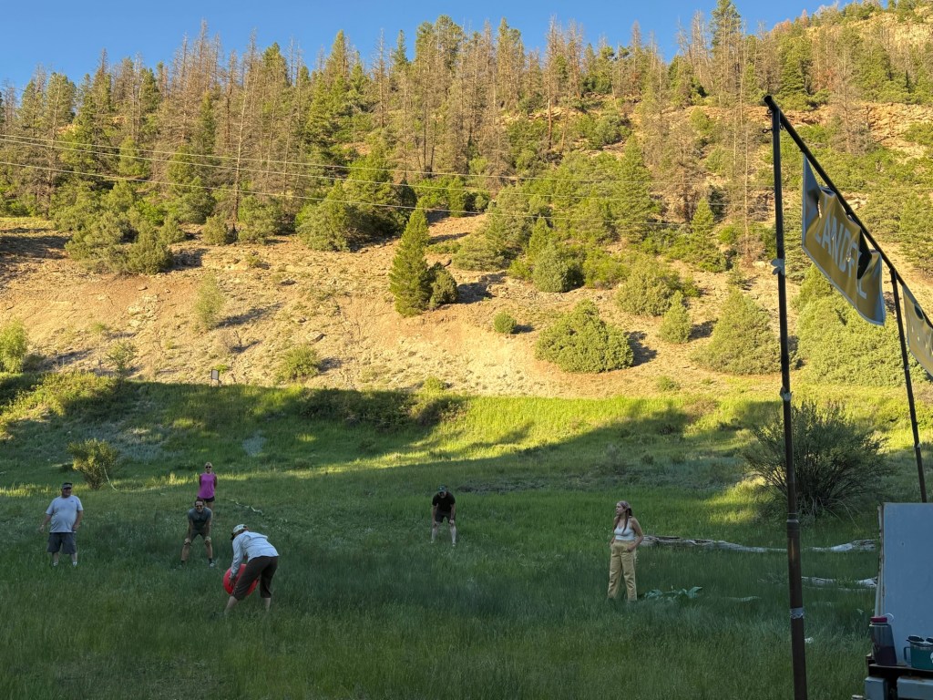 While we arrived early, we were by no means the first people there. We scoped out a great little spot for Louie. It was between two tall pine trees with enough sun to recharge our solar, but enough shade throughout the day so that we didn’t roast. I maneuvered some logs and stones so that our space was fairly well defended, and that was good, because by Thursday morning there were tents and lean-tos and cars shoved in every semi flat, sort of cleared spot. but we were not over crowded. It really worked well. We really relaxed for the first few days. We read and napped and played guitar and hung out with some fellow campers. We even joined in on the campsite kickball game. And Larry turned out to be a complete ringer for his team. He got me out twice, but I couldn’t say mad at him for long.