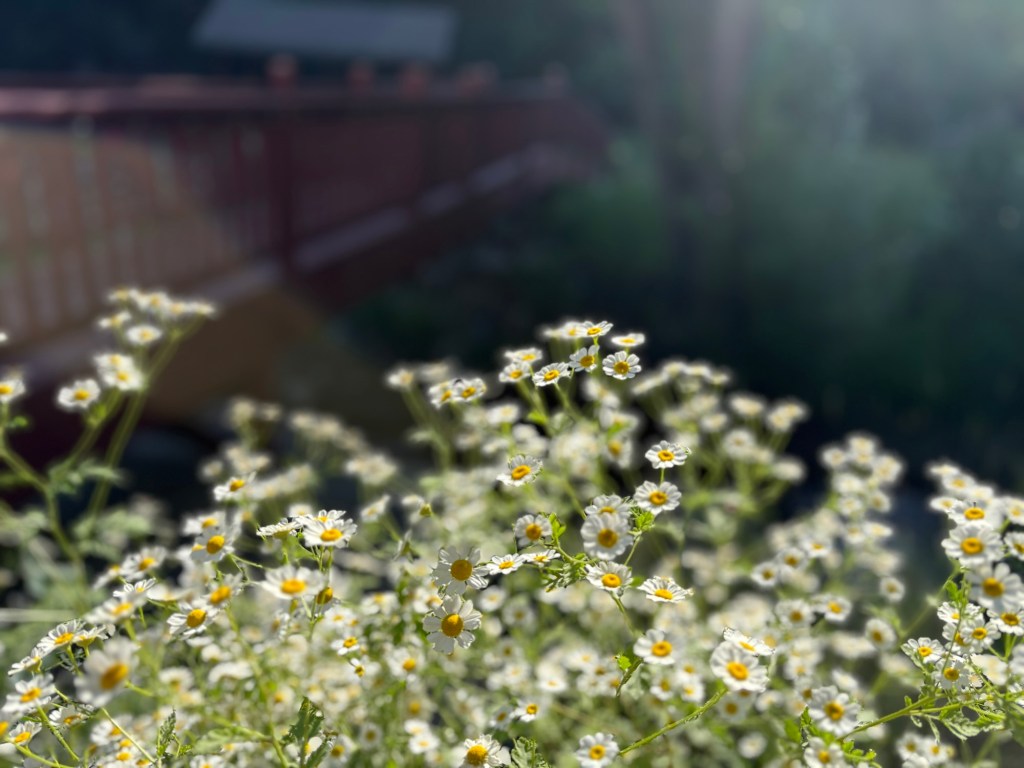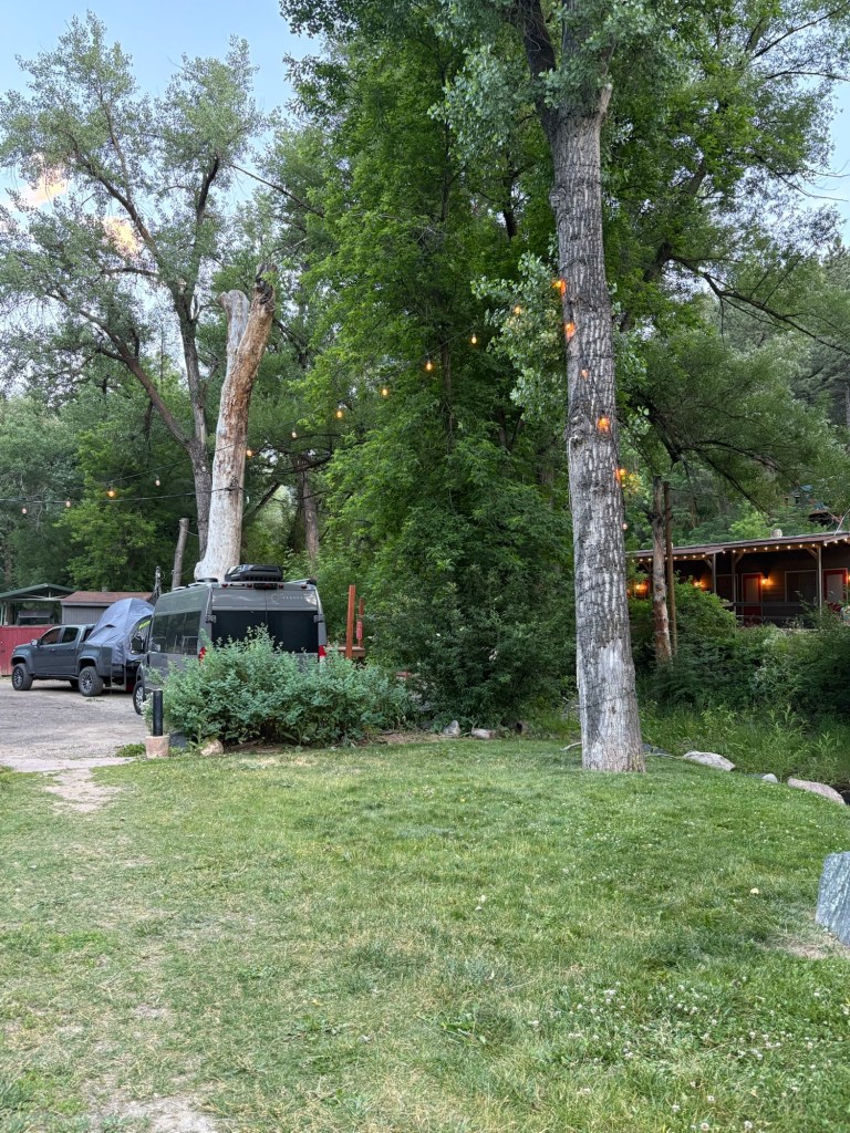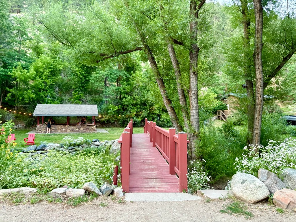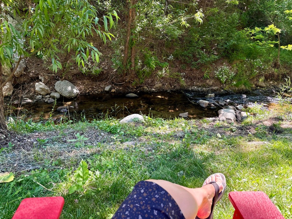 We enjoyed two days in Boulder after the pet sit. We stayed at a place called A Lodge, a very interesting type of accommodation. There are rooms, suites, tent camping, and van camping. There’s a pool, sauna, hot tub, outdoor cooking pavilion, lodge with comfortable seats, games, and provisions, and a gorgeous little river (or big stream) running through it all. Clouds of tansy surround the water, filling the breeze with a floral scent. The site was just on the outskirts of the city limits, through the Colorado Canyon, which has the river version of our stream rushing in a serpentine patterns through some very beautiful countryside. The river is a popular spot when the temperature is high, and yesterday it was in the 90s, so there were heaps of people cooling off. Yesterday, while Larry worked, I spent a lot of time sitting by the stream, listening to it flow, letting the sound surround me and wash away all thoughts and fears and doubts. Ladybugs, hummingbirds, robins, orioles, and woodpeckers shared the space.