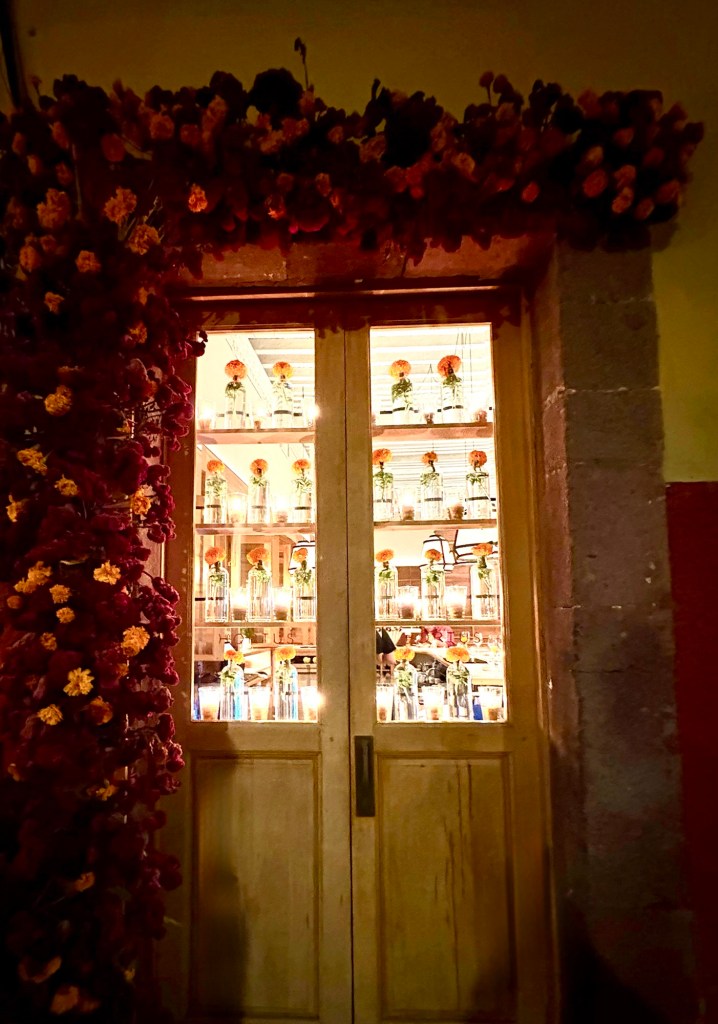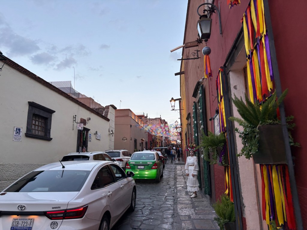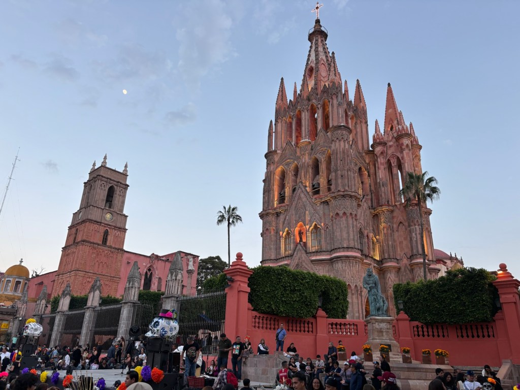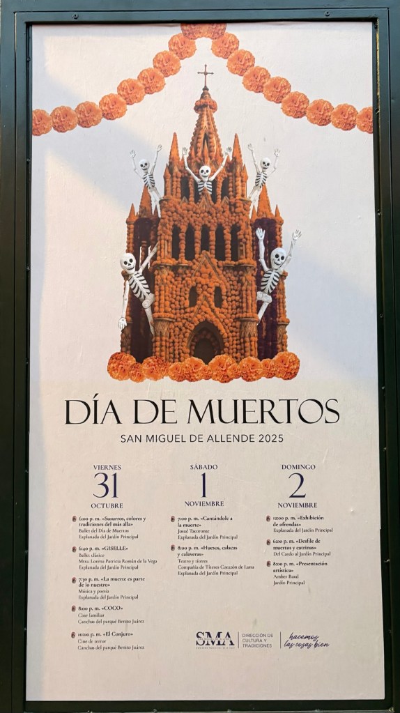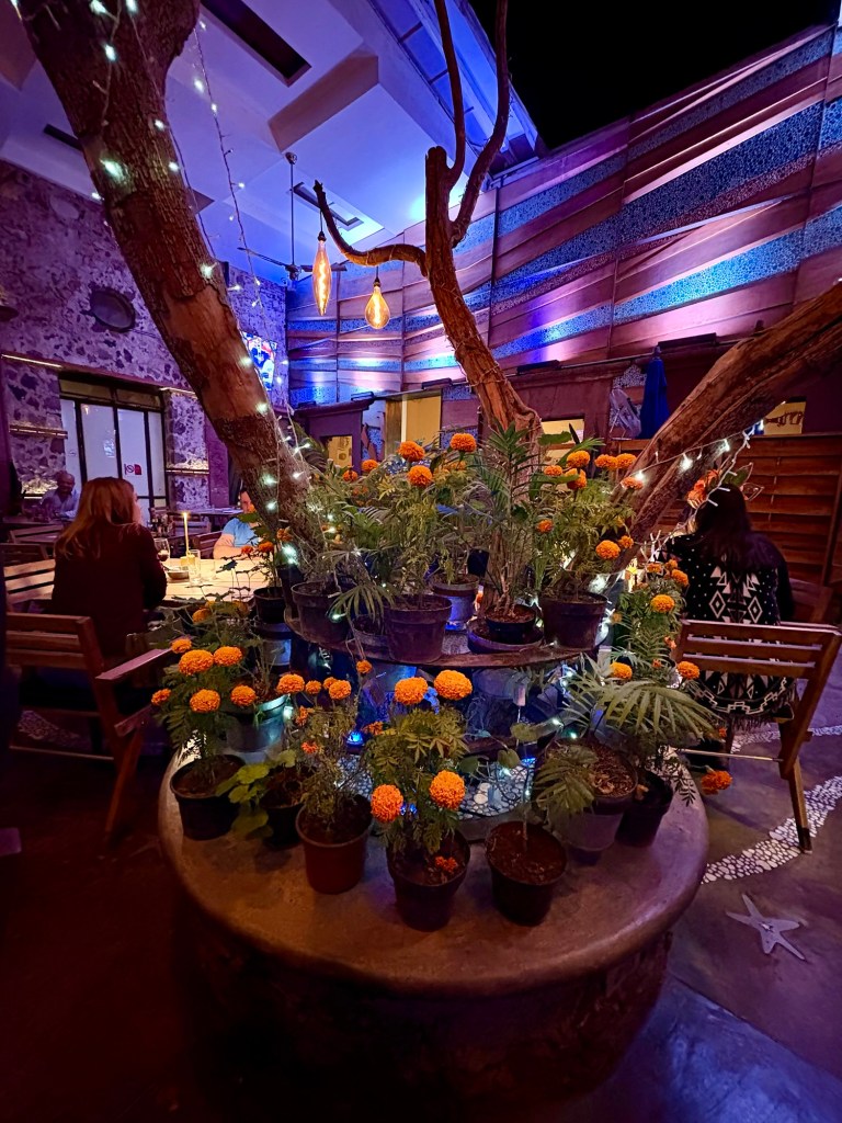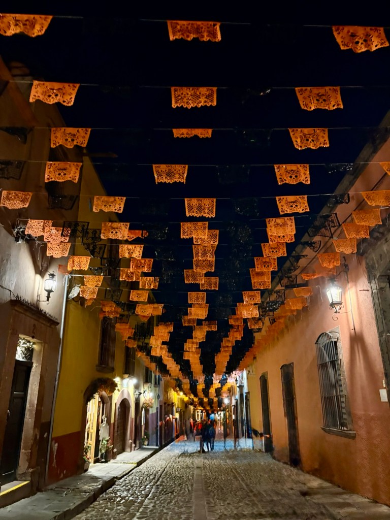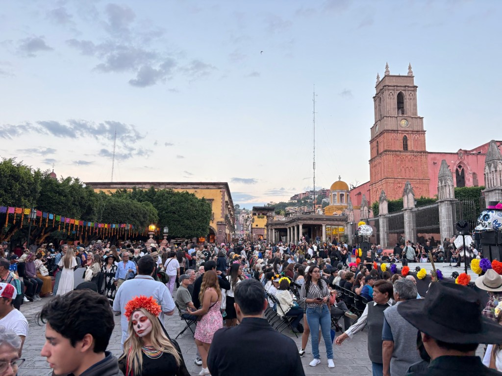 We arrived in San Miguel de Allende (elevation over 6000 feet) on a big feast day: Día de los muertos, Day of the Dead. It is a very important holiday, one where ancestors are honored and remembered. Marigolds are everywhere, and the whole town is bedecked in colorful banners, flowers, and candles. It was absolutely magical. We wandered around the historic downtown enjoying the vibes, listening to the mariachi music, watching all the people — so many of them in costume and face painting. The cobblestoned streets and high narrow sidewalks were filled with families. It was beautiful. We ducked into a random restaurant for pozole and flautas, then continued our stroll. The streets were getting more and more crowded. The mass at the church was spilling into the courtyard. The musicians were performing on the stage. It was such a festive atmosphere.