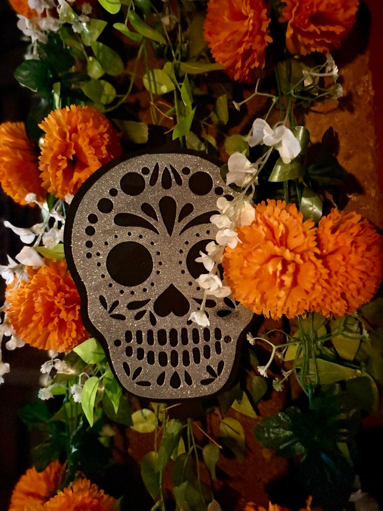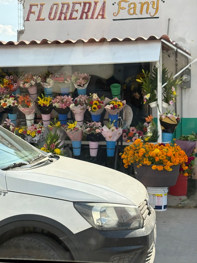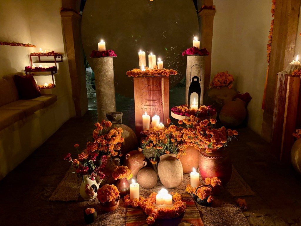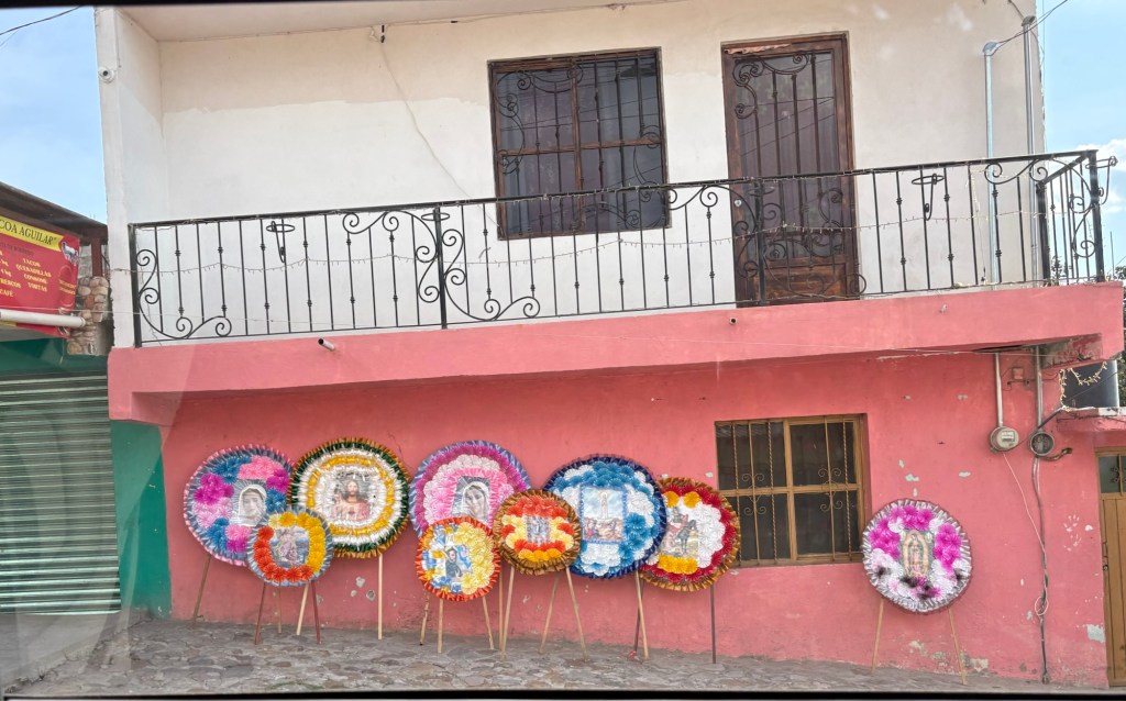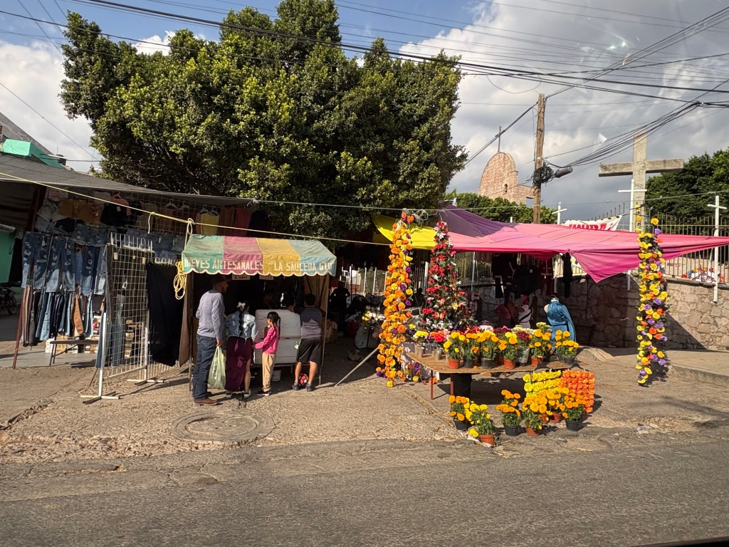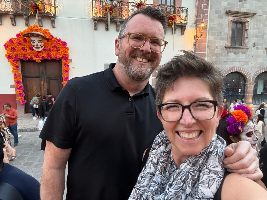 We arrived in San Miguel de Allende (elevation over 6000 feet) on a big feast day: Día de los muertos, Day of the Dead. It is a very important holiday, one where ancestors are honored and remembered. Marigolds are everywhere, and the whole town is bedecked in colorful banners, flowers, and candles. It was absolutely magical. We wandered around the historic downtown enjoying the vibes, listening to the mariachi music, watching all the people — so many of them in costume and face painting. The cobblestoned streets and high narrow sidewalks were filled with families. It was beautiful. We ducked into a random restaurant for pozole and flautas, then continued our stroll. The streets were getting more and more crowded. The mass at the church was spilling into the courtyard. The musicians were performing on the stage. It was such a festive atmosphere.