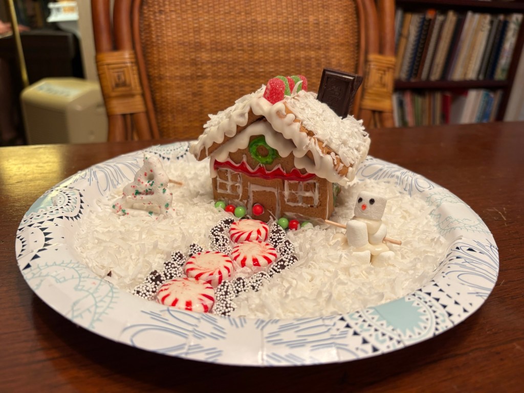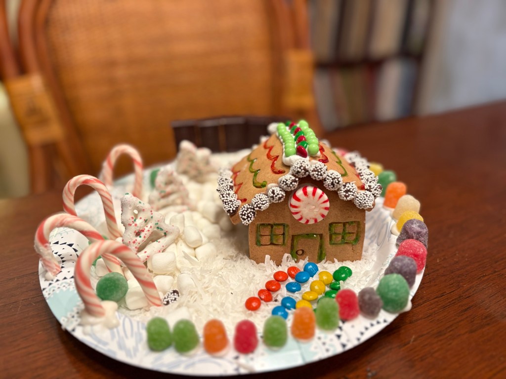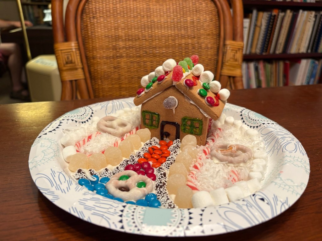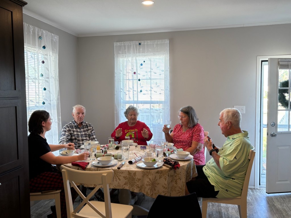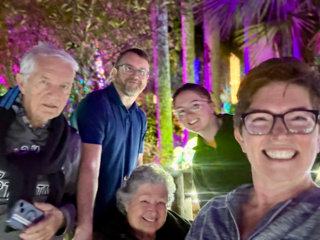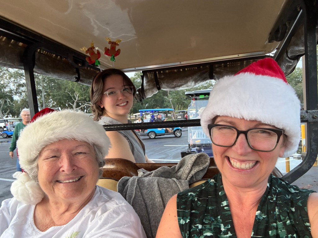 We had a wonderful holiday season with friends and family. While we desperately missed Elliot and Alexa, we cherished every second of our time with Meredith. Two weeks is not a long time, but it was enough to fill our cups and do some really fun things. Together we made gingerbread houses and pizzas. We saw Christmas lights and Goofy. We kayaked past alligators and turtles and swam in a spring fed river. We played Tuck and Cribbage and worked on a very hard puzzle. We ate Japanese, Italian, and Larry’s amazing Christmas Feast. We sang and strummed. We drove in golf carts, convertibles, and Louie. We laughed and hugged and snuggled. We went to the gym, book store, and thrift stores. And collectively we made plans for next Christmas when (god willing) we are all together.