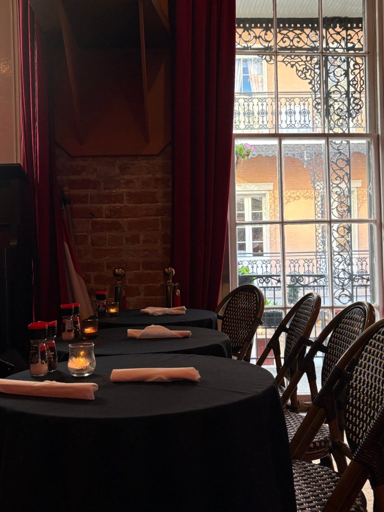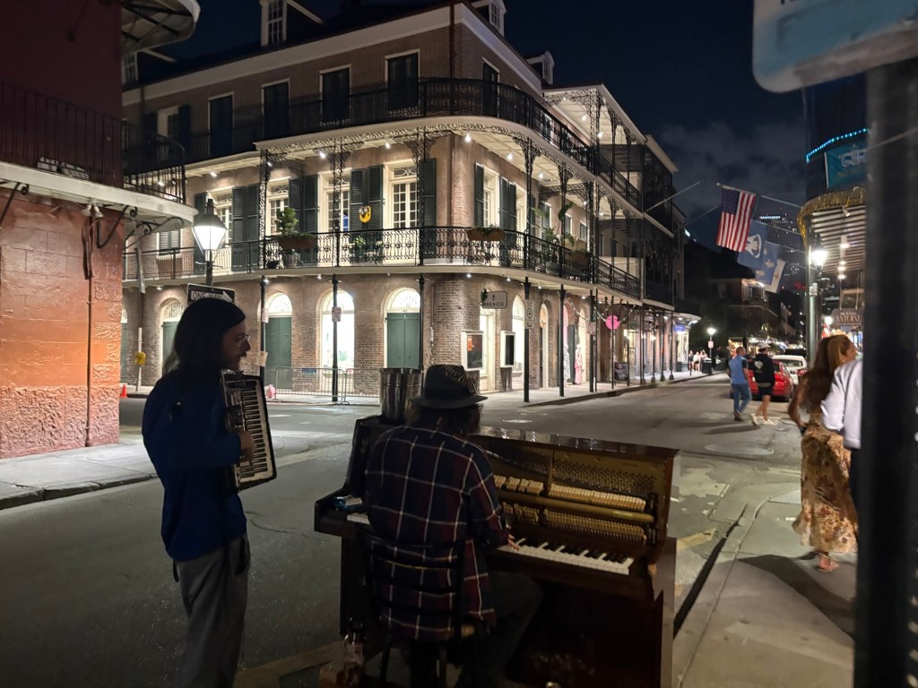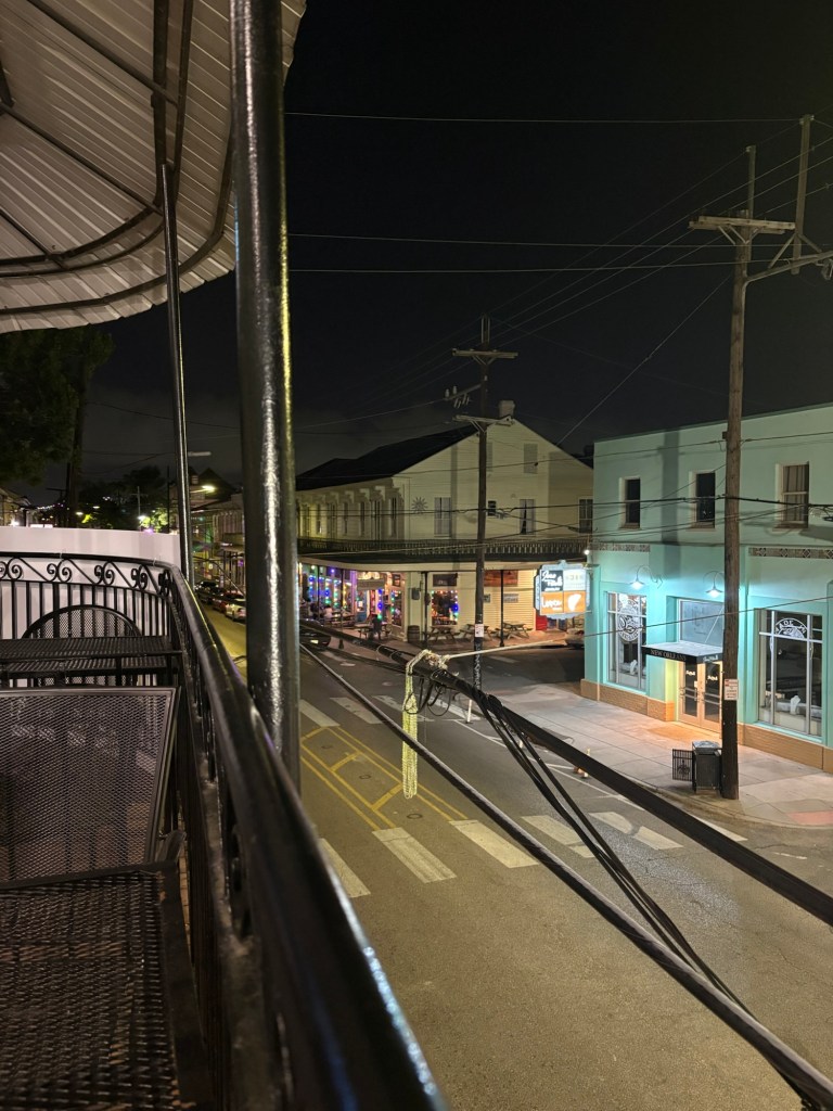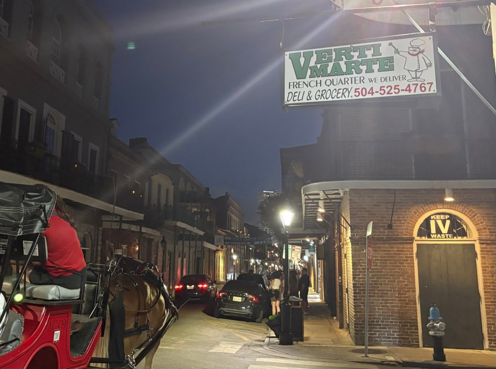 After we caught back up with each other, we made our way through the Quarter, but there was a very different feel. The power had been out for about an hour. The gas lamps were the only lights shining. No businesses could take credit cards, so very few tourists were around. No electric speaker could blast music so it was relatively quiet. The only busker was playing an upright piano wheeled out to the curb and an accordion. We happened to have cash in our pockets and familiarity with the lay of the neighborhood, so we found an outdoor table, a glass of wine, and we sat and enjoyed an early morning energy with the golden hour afternoon light while chatting with the locals. It didn’t last longer than a couple hours, but it was pretty magical.