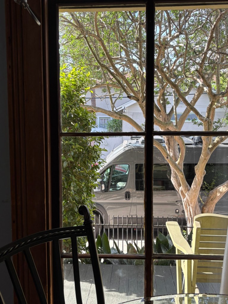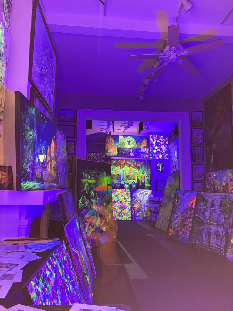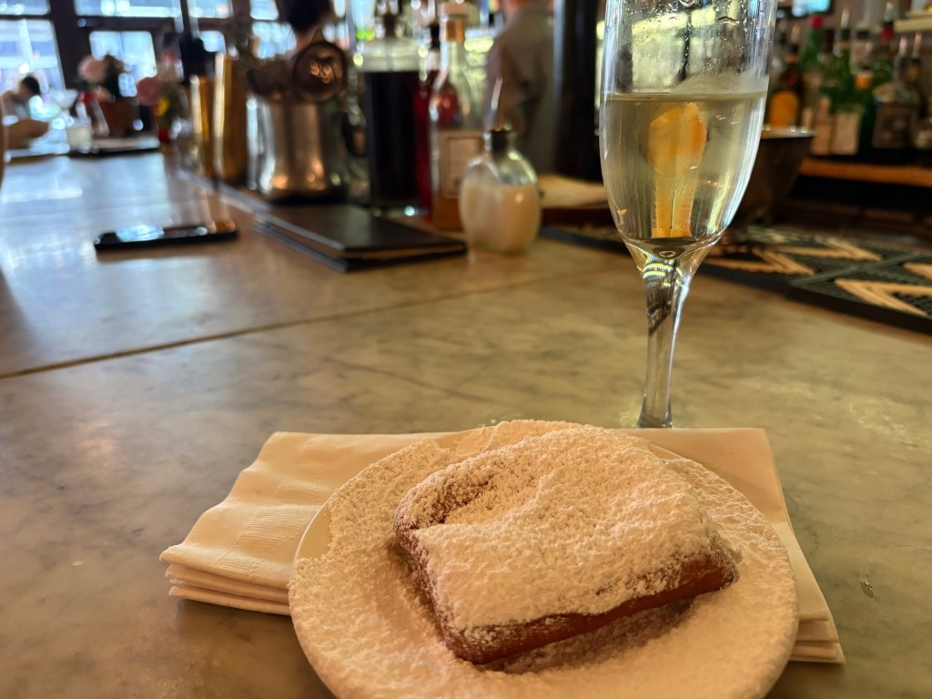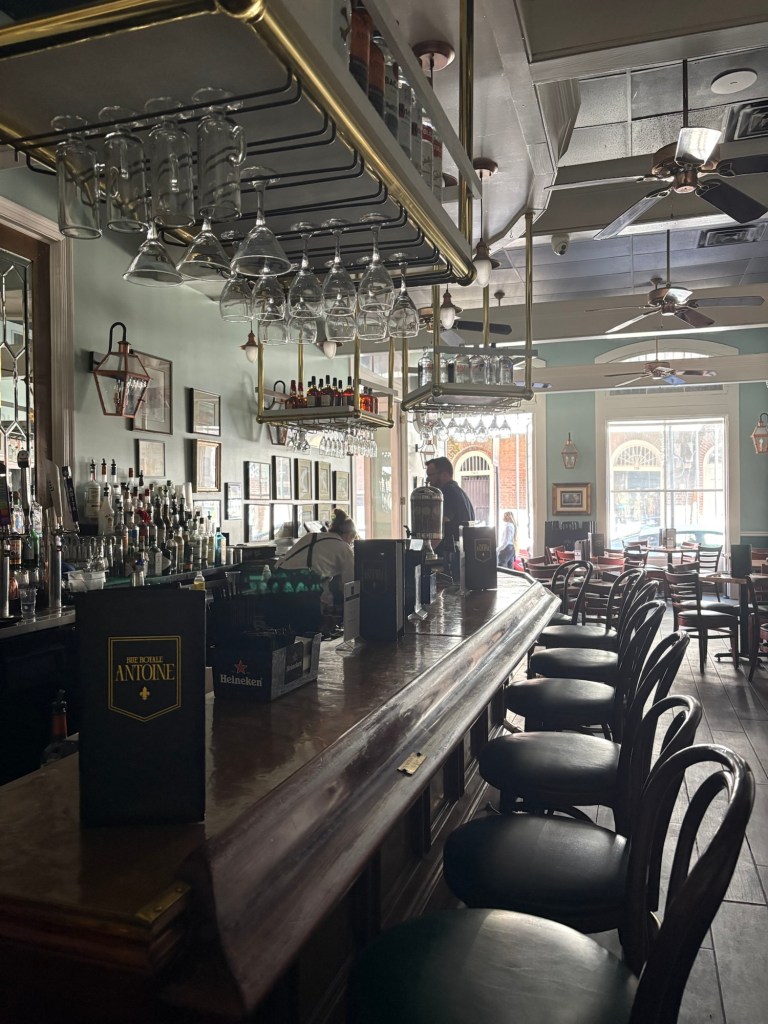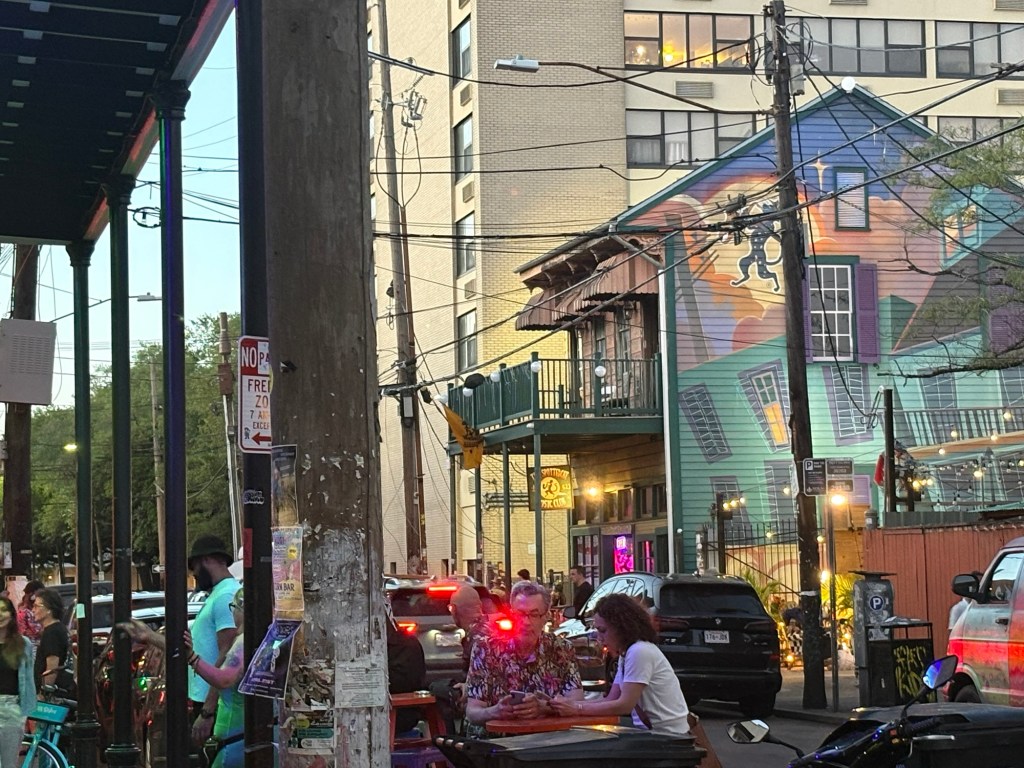 After we caught back up with each other, we made our way through the Quarter, but there was a very different feel. The power had been out for about an hour. The gas lamps were the only lights shining. No businesses could take credit cards, so very few tourists were around. No electric speaker could blast music so it was relatively quiet. The only busker was playing an upright piano wheeled out to the curb and an accordion. We happened to have cash in our pockets and familiarity with the lay of the neighborhood, so we found an outdoor table, a glass of wine, and we sat and enjoyed an early morning energy with the golden hour afternoon light while chatting with the locals. It didn’t last longer than a couple hours, but it was pretty magical.
