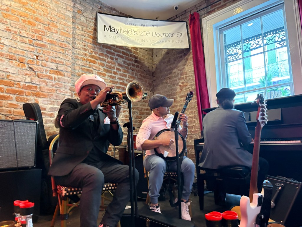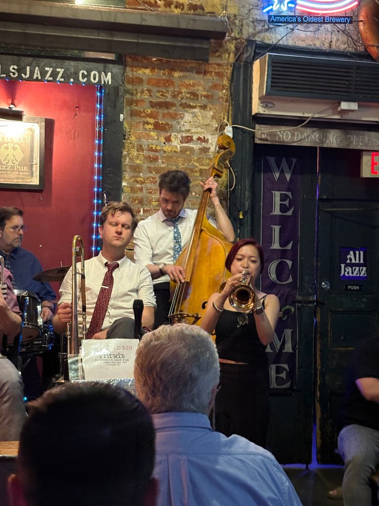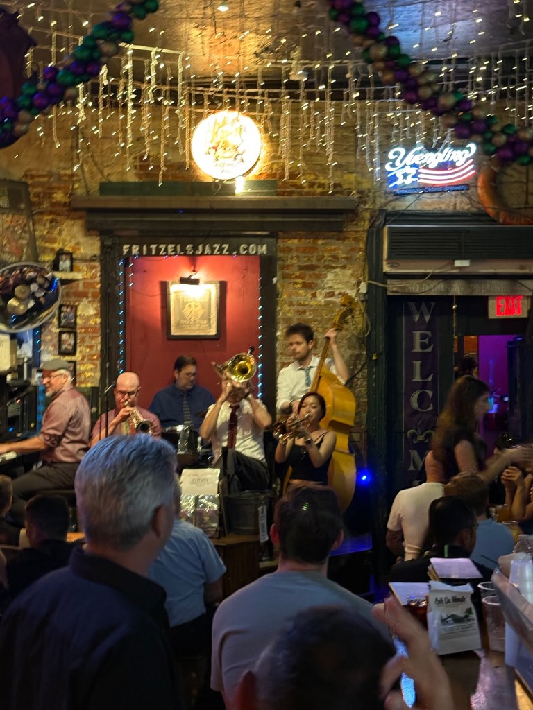We listened to as much live music as we could find. That meant hanging in the Quarter and on Frenchmen St, where we got to enjoy the legendary Kermitt Ruffins and Irvin Mayfield, at Felix’s; we saw Sweetie Pie at the Spotted Cat; and we wandered in and out of clubs and bars listening to such talented musicians and bands filling the days and nights with music and song.
